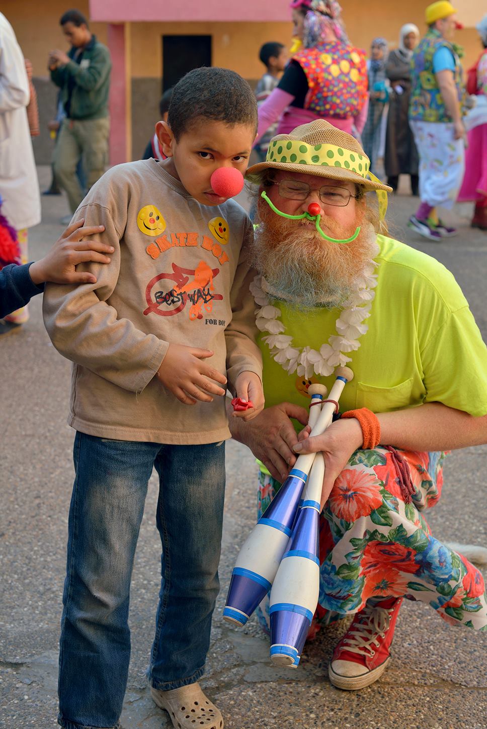 Morocco is a beautiful country and the people were very loving and kind. I learned things I would have never learned. I healed a part of my life that I had been taught not to trust. We spent 8 to 11 hours a day clowning for children. We traveled together feeling safe with the bus trips and food all pre-planned for us. One night, 20 of us even went out dancing in our clown costumes. What a scene!